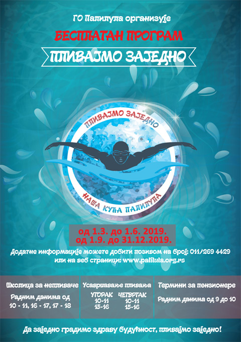 Градска општина Палилула наставља са програмом "Пливајмо заједно" на пливалишту "Ташмајдан" од 1. 3. до 1. 6. 2019. и од 1. 9. до 31. 12. 2019. године.