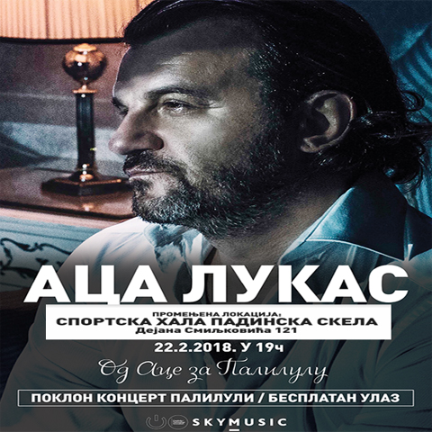Због лоших временских услова концерт Аце Лукаса ће се уместо у Борчи, одржати у Спортској хали у Падинској Скели у четвртак 22. фебруара у 19 часова, улазак од 18 часова.
