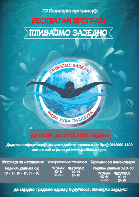 Градска општина Палилула наставља са програмом „Пливајмо заједно“ који подразумева бесплатно пливање за основце и пензионере на пливалишту "Ташмајдан" од 1. септембра до 27. децембра 2021. године.
